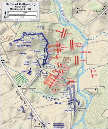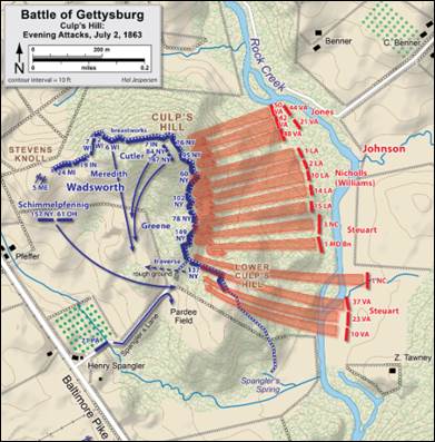 General Johnson’s July 3rd Attack on Culp’s Hill at Gettysburg. (Wikipedia)
