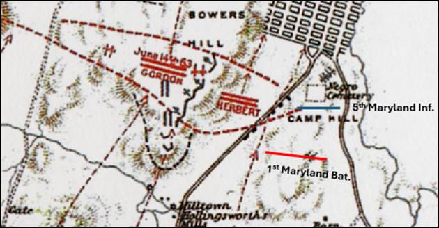 Position of the 5th Maryland, Union, and 1st Maryland Battalion, Confederate, at Winchester on the Afternoon of June 14.